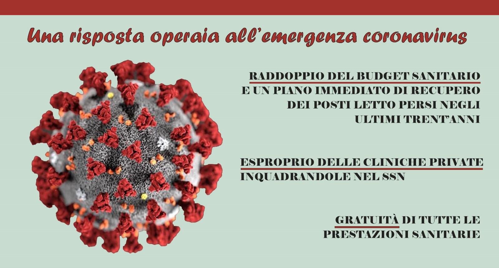 – il raddoppio del budget sanitario e un piano immediato di recupero dei posti letto persi negli ultimi trent’anni; esproprio delle cliniche private inquadrandole nel #SSN; #gratuità di tutte le prestazioni #sanitarie