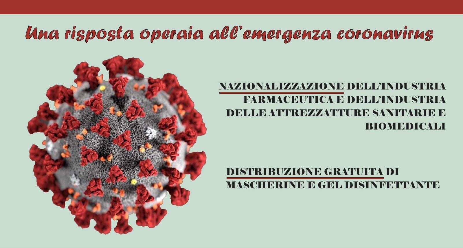 – #Nazionalizzazione dell’industria farmaceutica e dell’industria delle attrezzatture sanitarie e biomedicali; distribuzione gratuita di #mascherine e #geldisinfettante