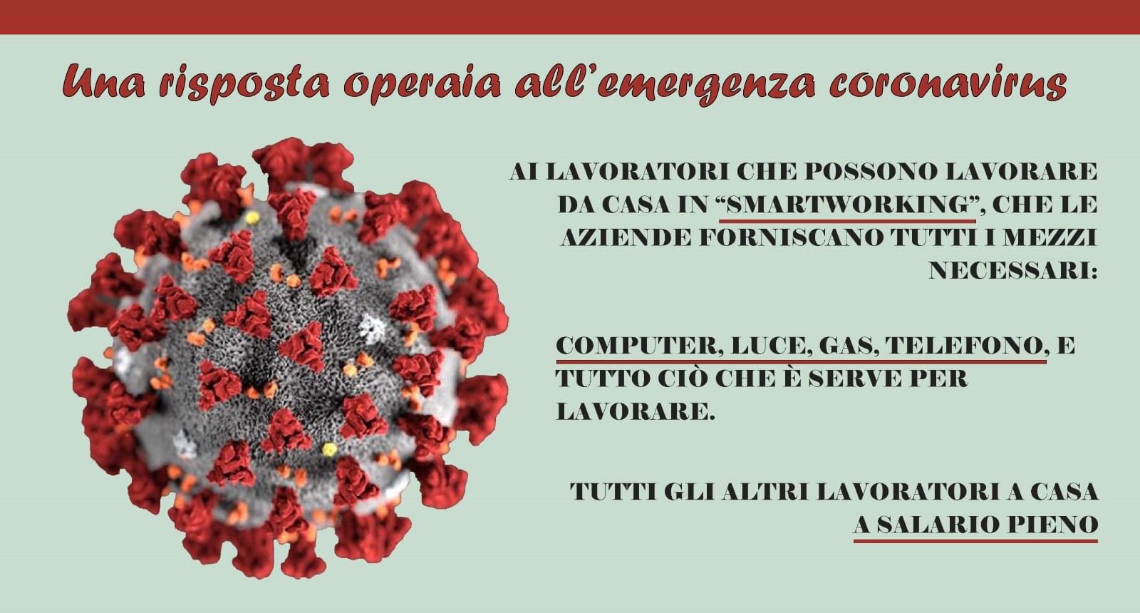 – Ai lavoratori che possono lavorare in modalità lavoro agile (“#Smartworking”), che le aziende forniscano tutti i mezzi necessari: #computer, utenze necessarie (#gas, #luce, #telefono, ecc.); tutti gli altri lavoratori a casa a #salariopieno