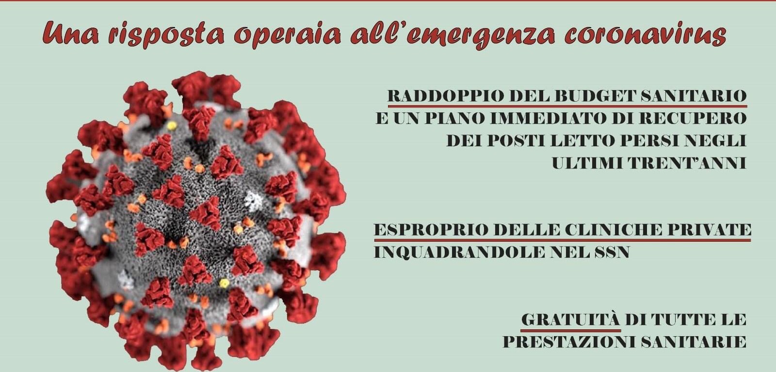 – il raddoppio del budget sanitario e un piano immediato di recupero dei posti letto persi negli ultimi trent’anni; esproprio delle cliniche private inquadrandole nel #SSN; #gratuità di tutte le prestazioni #sanitarie