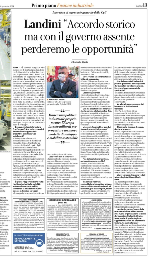 Questa breve premessa giustifica l’evoluzione della natura del sindacato padronale che può essere perfettamente riscontrabile nella recente intervista rilasciata lo scorso 6 Gennaio dal segretario CGIL, Maurizio Landini, sulle colonne di Repubblica (giornale acquisito dalla famiglia Agnelli), in merito alla fusione in Stallantis fra i due colossi automobilistici: Fiat e Peugeot.