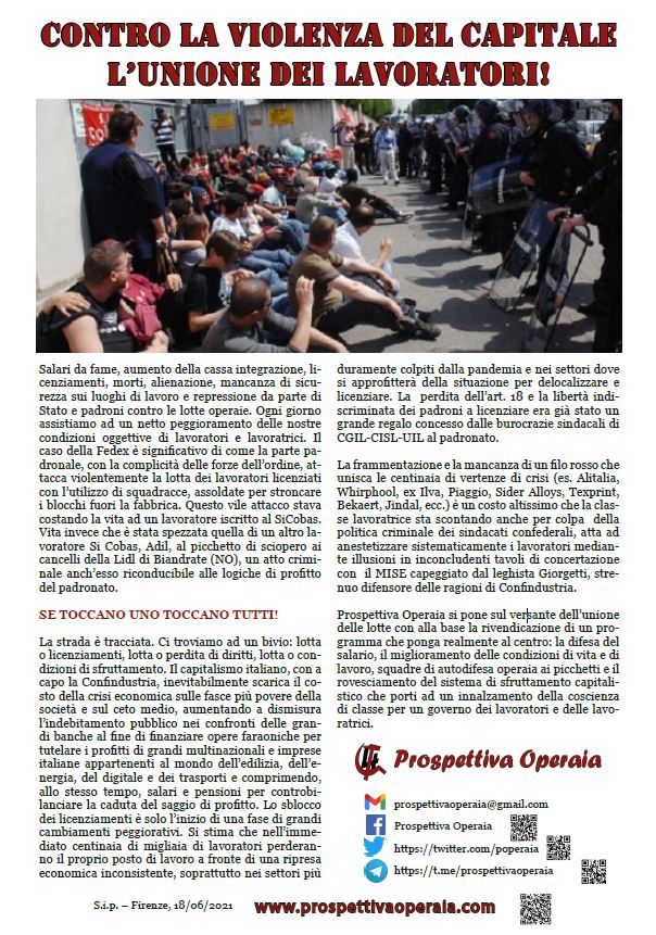 Prospettiva Operaia si pone sul versante dell’unione delle lotte con alla base la rivendicazione di un programma che ponga realmente al centro: la difesa del salario, il miglioramento delle condizioni di vita e di lavoro, squadre di autodifesa operaia ai picchetti e il rovesciamento del sistema di sfruttamento capitalistico che porti ad un innalzamento della coscienza di classe per un governo dei lavoratori e delle lavoratrici.