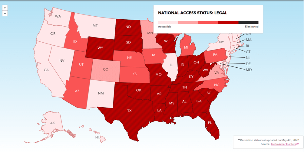 Gli stati di colore rosa scuro e rosso applicano restrizioni al finanziamento statale delle interruzioni volontarie di gravidanza o alla possibilità di vedersi rimborsare le spese sostenute dall’assicurazione sanitaria (che negli USA si paga profumatamente, by the way). Agiscono dunque principalmente sul costo e sull’accessibilità economica. Molti inoltre vietano l’aborto in tutti i casi in cui la vita della gestante non sia in pericolo. Texas e Oklahoma hanno anche imposto una finestra temporale di 6 settimane alla possibilità di interrompere la gravidanza.