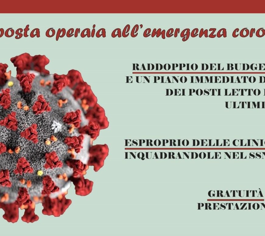 – il raddoppio del budget sanitario e un piano immediato di recupero dei posti letto persi negli ultimi trent’anni; esproprio delle cliniche private inquadrandole nel #SSN; #gratuità di tutte le prestazioni #sanitarie– una giornata lavorativa di massimo 6 ore e settimana lavorativa di massimo 30 ore per i lavoratori del settore sanitario, del settore farmaceutico e del settore dell’industria biomedicale– l’#assunzione immediata, a salario pieno … Continua a leggere UNA RISPOSTA OPERAIA ALL’EMERGENZA CORONAVIRUS